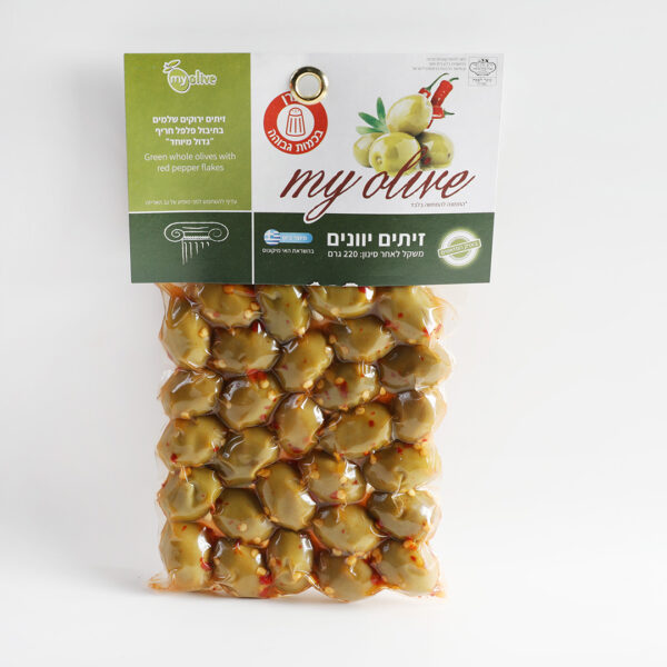 מארז זיתים ירוקים מיובאים מיוון בתיבול פלפל חריף – 220 גרם במארז